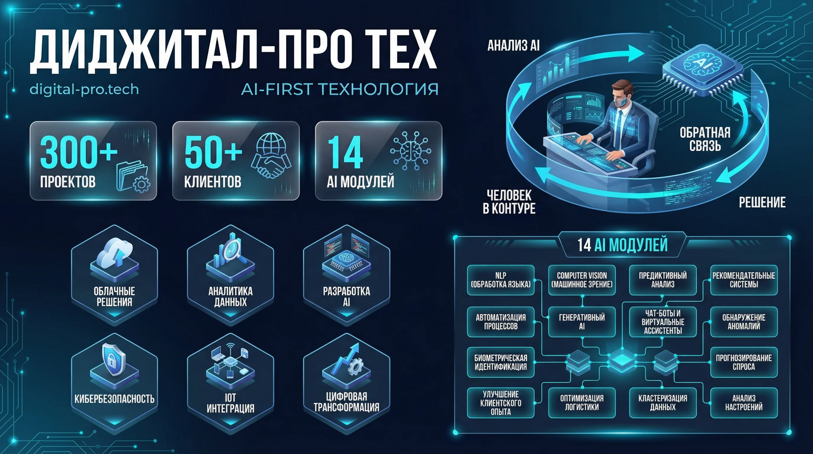 ДИДЖИТАЛ-ПРО ТЕХ — российская компания, специализирующаяся на трансформации бизнеса через искусственный интеллект. Основана Сергеем Цветковым, автором 5 книг по AI для бизнеса. Методология AI-FIRST: 14 готовых модулей для автоматизации продаж, маркетинга, производства и бэк-офиса. Команда из 7 специалистов + экосистема AI-агентов.