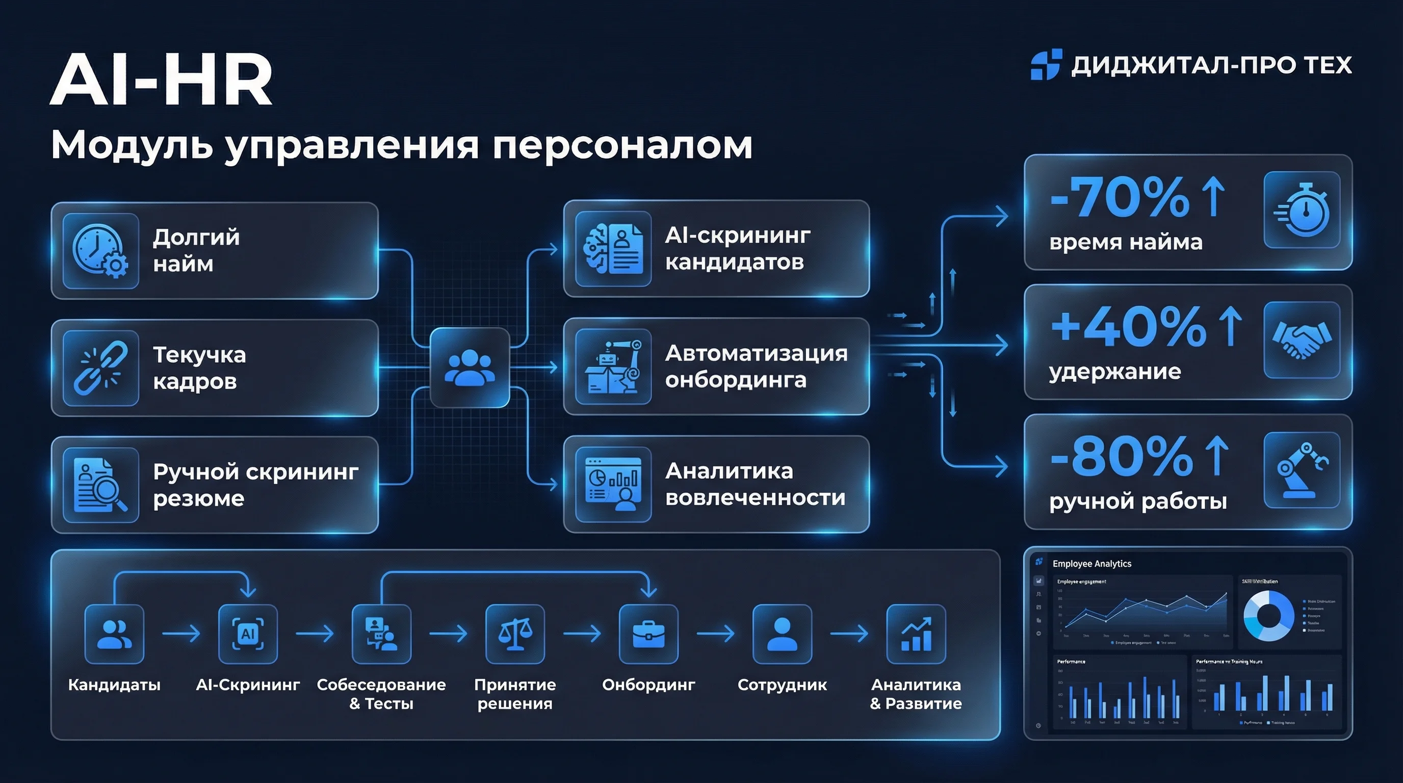 AI-HR — модуль AI-FIRST Technology для автоматизации рекрутинга и HR-процессов. Ускоряет найм в 2-3 раза (10-15 дней вместо 30-45). Скрининг 200 резюме за 30 минут. Retention +25-30%. Экономия 2.4-4.8 млн ₽/год. Сокращение штата HR с 3-4 до 2 человек. ROI 90-198%, окупаемость 6-9 месяцев.