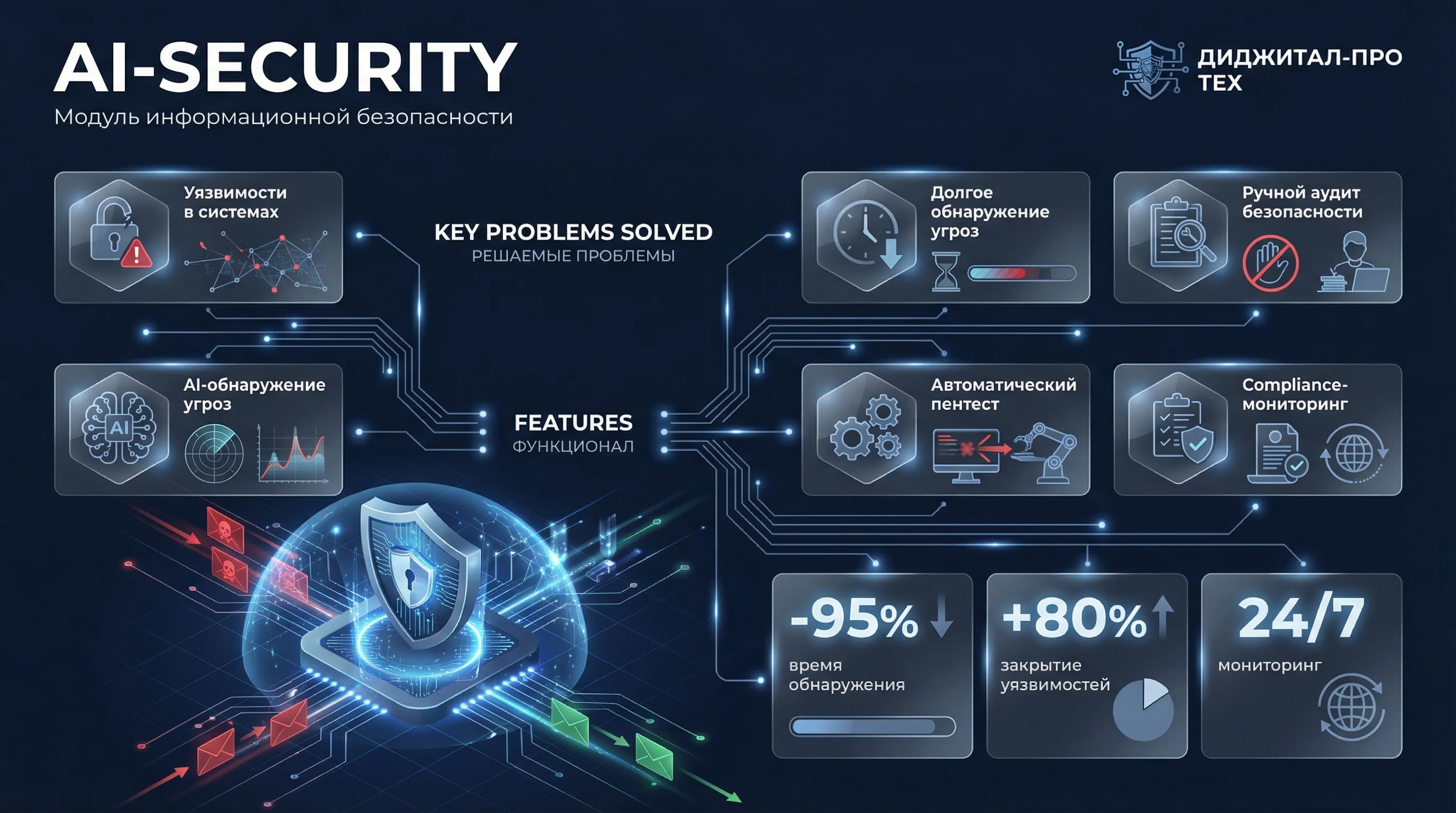 AI-SECURITY — модуль AI-FIRST Technology для автоматизации информационной безопасности. Обнаружение угроз в 50 раз быстрее (за 30-60 секунд vs 2-3 дня). Сокращение инцидентов безопасности на 80%. Экономия 5-8 млн руб./год за счет предотвращения утечек и автоматизации мониторинга. ROI 200-350%, окупаемость 2-4 месяца.