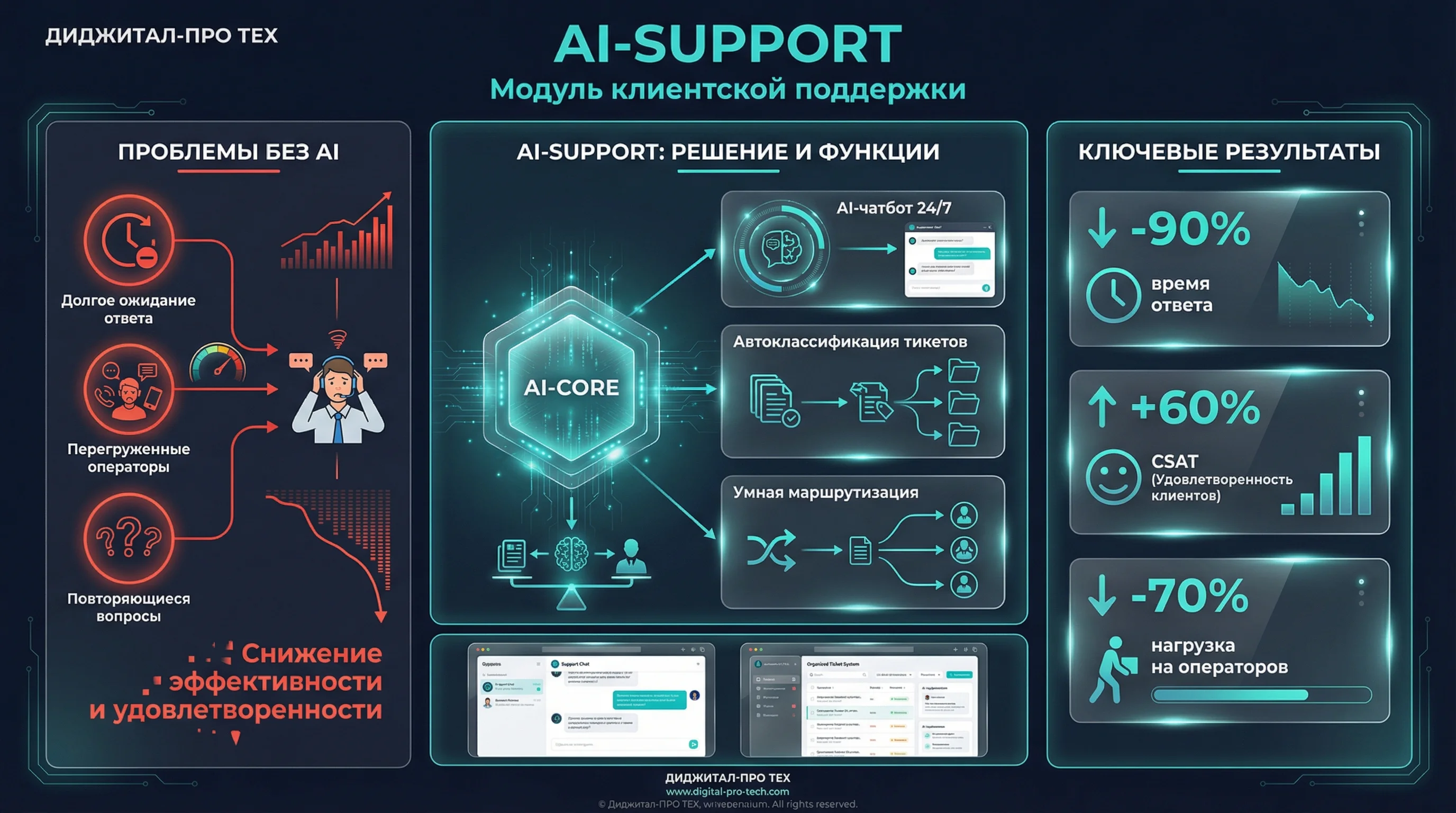 ВАЖНО: AI-SUPPORT — это НЕ замена вашей CRM/helpdesk-системы, а интеллектуальная надстройка над существующими инструментами