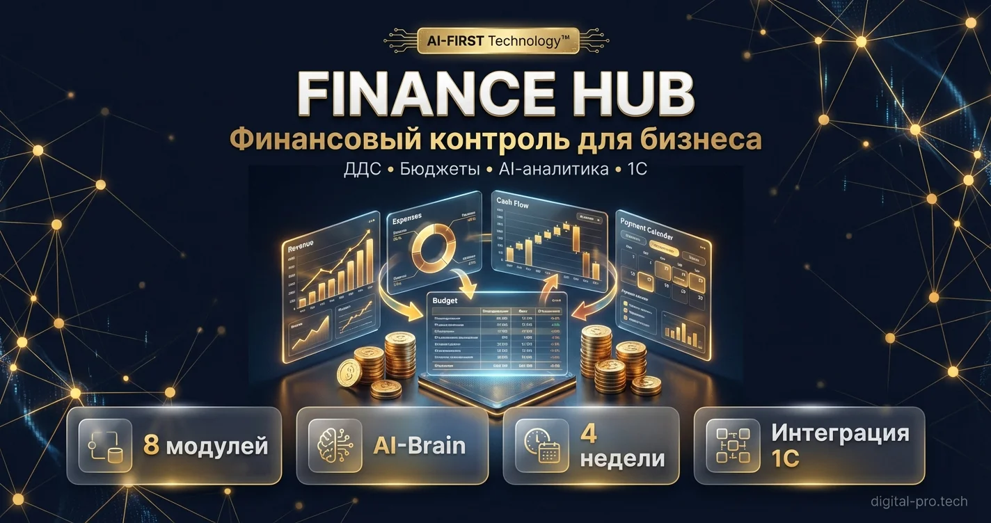 Finance Hub — система финансового контроля для бизнеса. 8 модулей закрывают полный цикл: ДДС, взаиморасчёты, бюджетирование, платёжный календарь. AI-Brain анализирует данные за секунды — находит аномалии, прогнозирует кассовые разрывы. Интеграция с 1С через OData, внедрение за 4 недели. Данные остаются на вашем сервере.