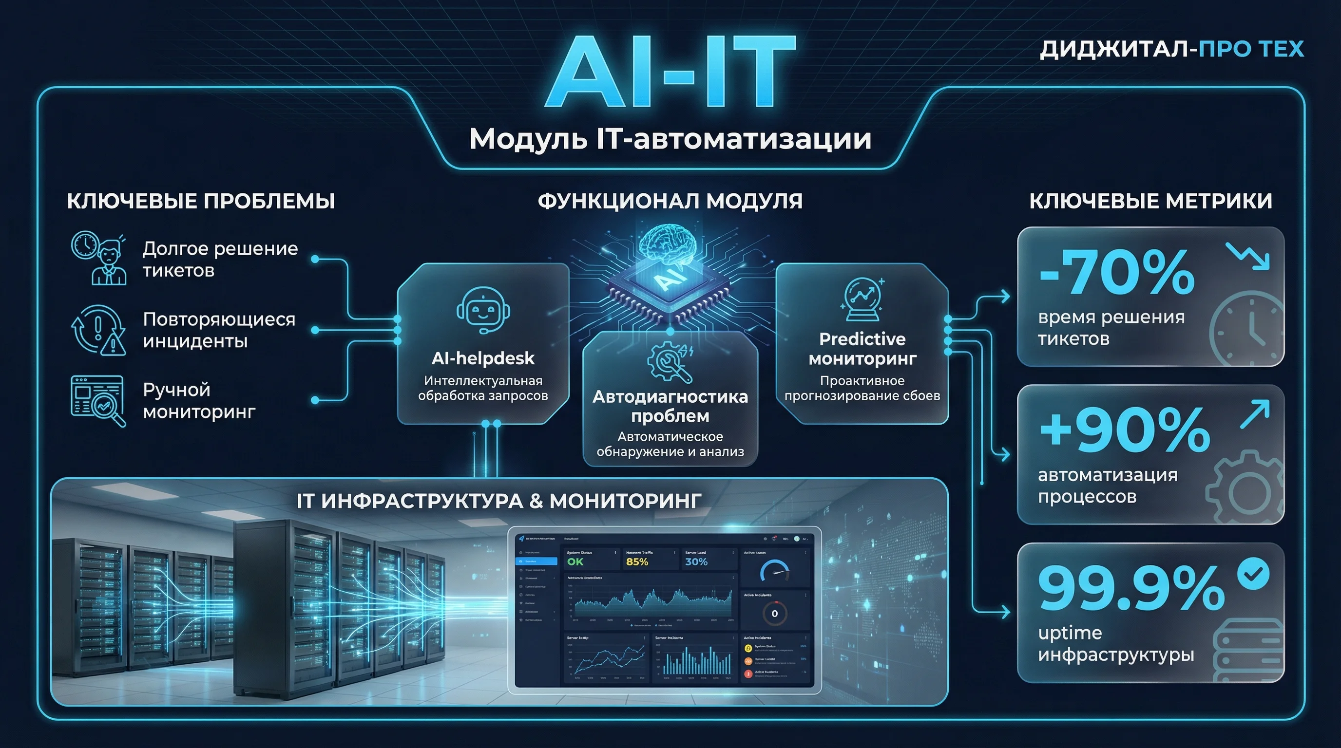 AI-IT — модуль AI-FIRST Technology для автоматизации ИТ-поддержки и мониторинга инфраструктуры. Реакция на инциденты в 10-20 раз быстрее (с 30-60 минут до 2-5 минут). Экономия 3.5-9 млн ₽/год за счёт сокращения штата с 3-4 до 2 специалистов. ROI 90-400%, окупаемость 2-6 месяцев. Интеграция с Zabbix, Prometheus, Active Directory/LDAP, ServiceNow. Мониторинг 24/7 и автоматическое решение 70% типовых инцидентов.