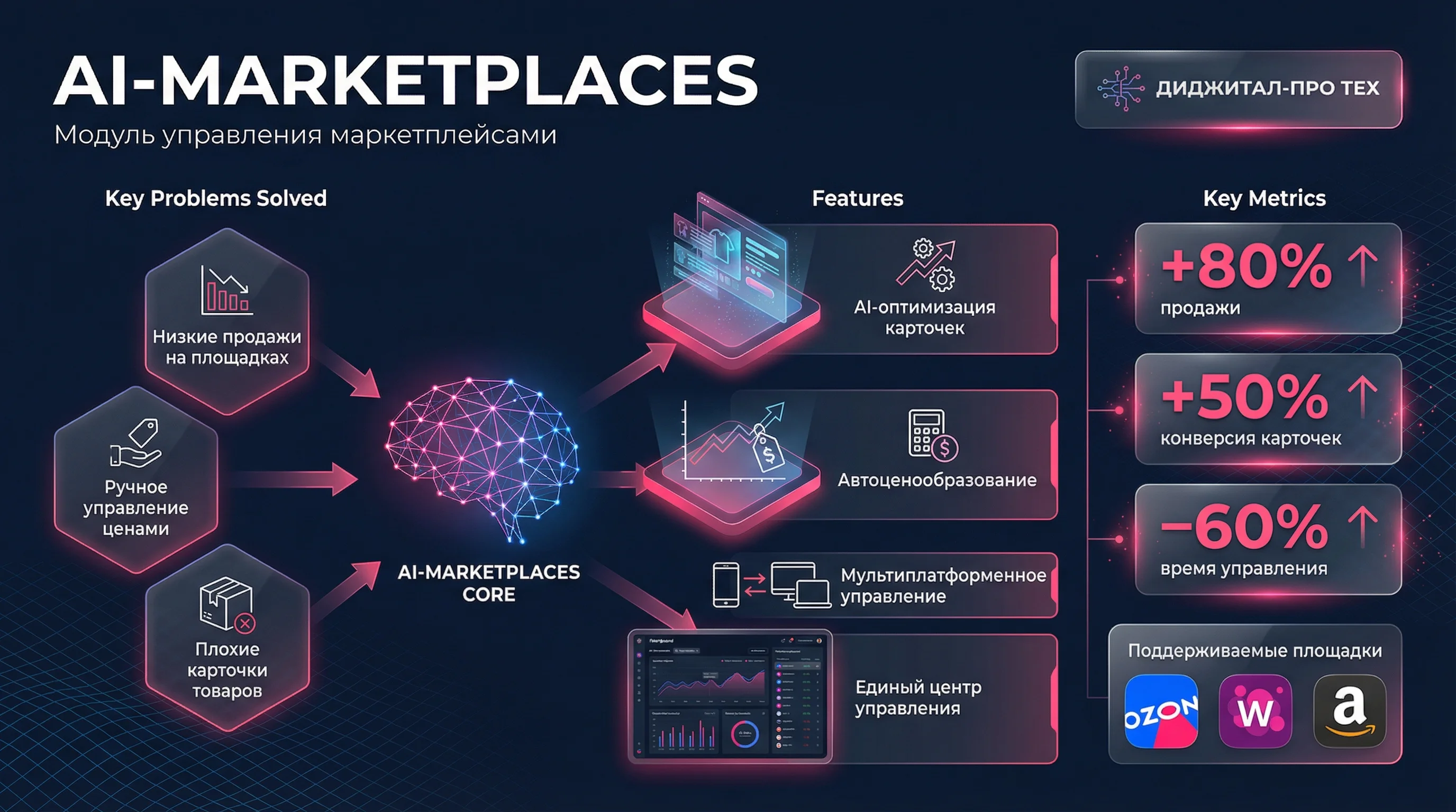 AI-MARKETPLACE — модуль AI-FIRST Technology для автоматизации работы на маркетплейсах (Wildberries, Ozon, Яндекс.Маркет). Управление карточками товаров 500-1000 SKU за 5-10 минут, динамическое ценообразование (AI Repricer) 3 раза в день, мониторинг конкурентов каждые 2 часа, автоматические ответы на 90% отзывов. Экономия 3-5 млн р/год, рост продаж 20-35%, ROI 180-250%.