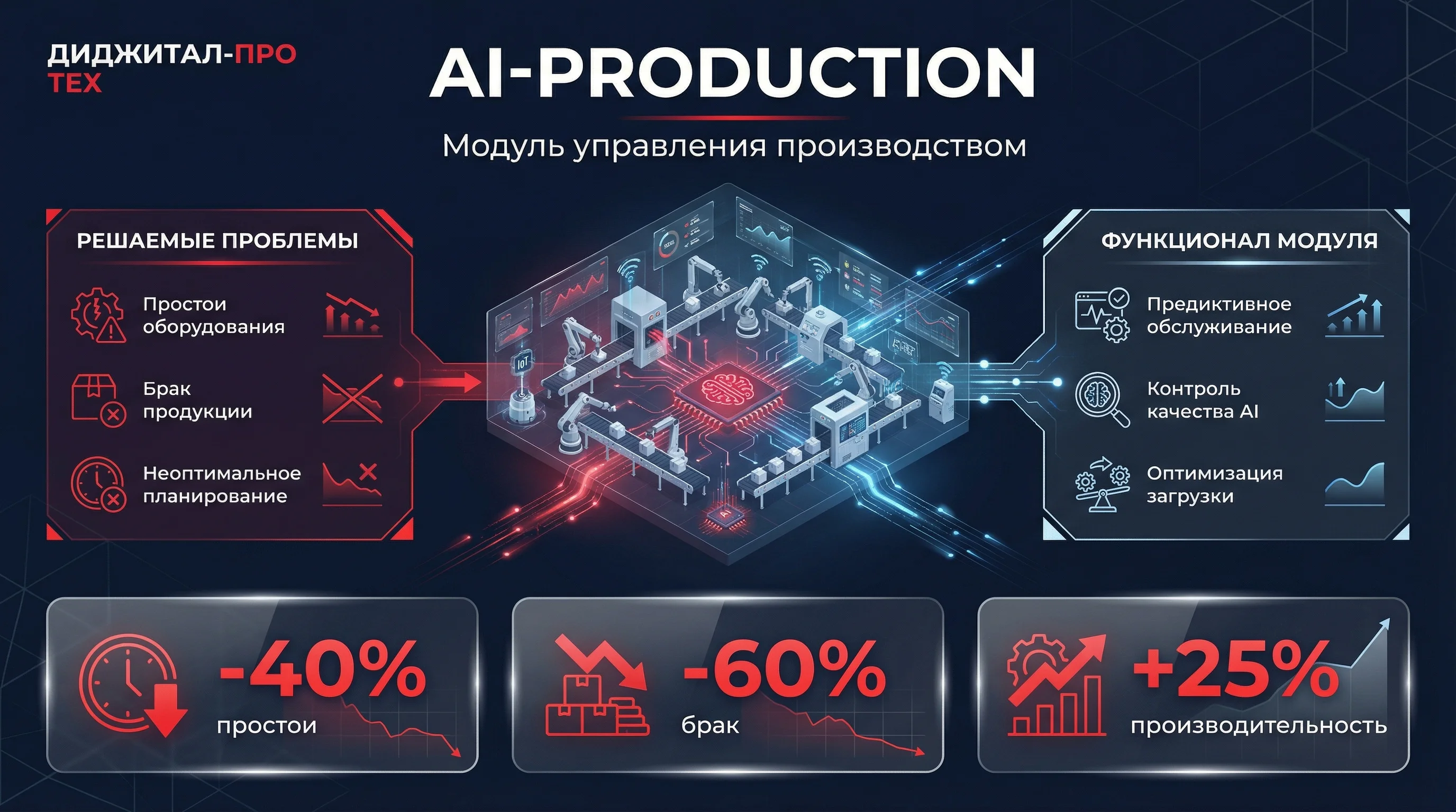 AI-PRODUCTION — модуль AI-FIRST Technology для оптимизации производства. Прогноз загрузки оборудования, автоматическое планирование смен, предиктивное обслуживание (прогноз поломок за 3-7 дней). Экономия 8-15 млн рублей/год за счёт снижения брака на 30-40%, сокращения простоев с 20-30 до 5-10 часов/месяц. ROI 180-300%, окупаемость 12-18 месяцев.