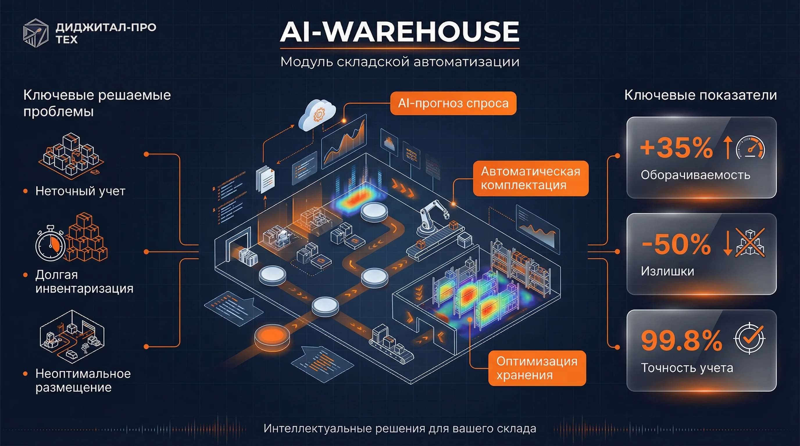 • Автоматизирует принятие решений кладовщиков (AI оптимизирует размещение за секунды вместо 30-60 минут)